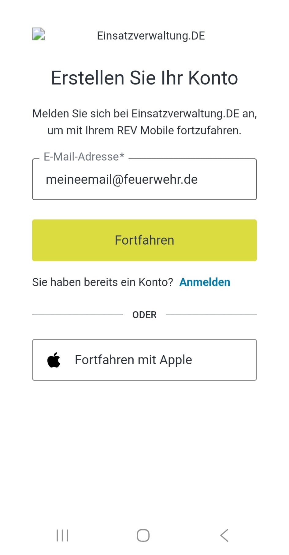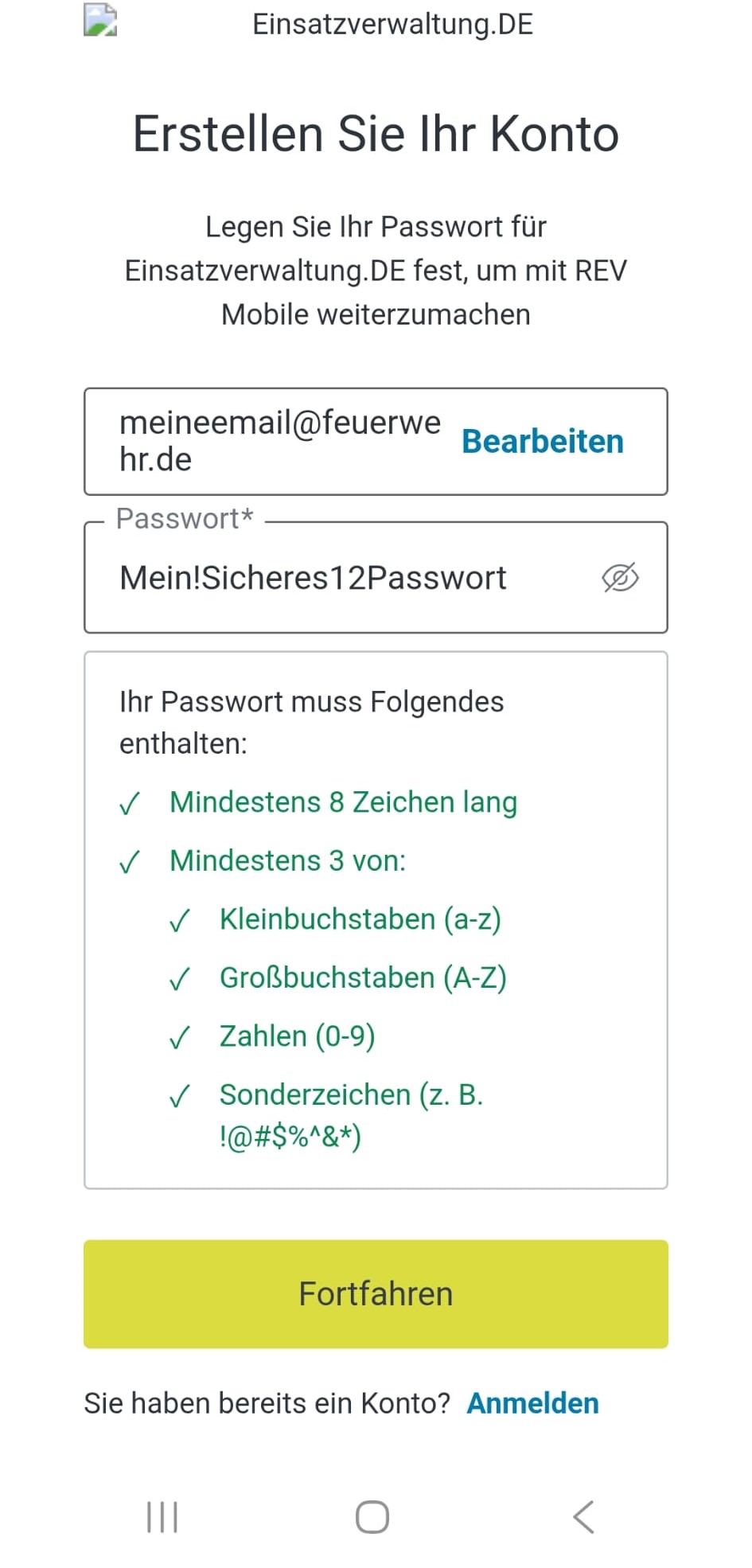 Beim Anlegen des Accounts kann es sinnvoll sein, die gleiche E-Mailadresse zu verwenden, die man bereits bei dem REV Pager Account verwendet hat. Denn alle Berechtigungen für diese E-Mailadresse bleiben erhalten. Dein Organisations-Admin muss dann keine Anpassung der Berechtigungen und Alarmgruppen durchführen.
